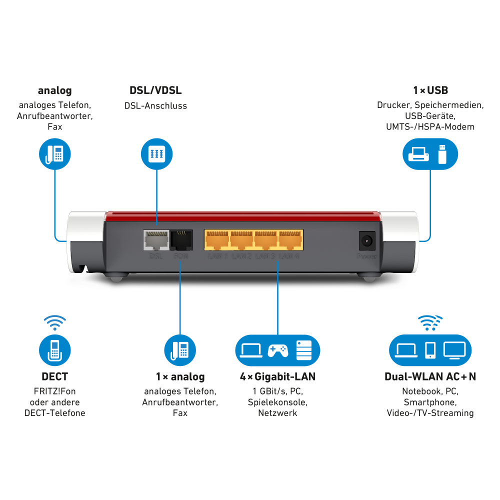 • 1 leistungsstarker USB-Anschluss für Speichermedien (NAS), Netzwerkdrucker und Mobilfunksticks
