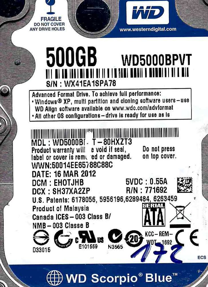 Modell : SATA WD5000BPVT-80HZT3