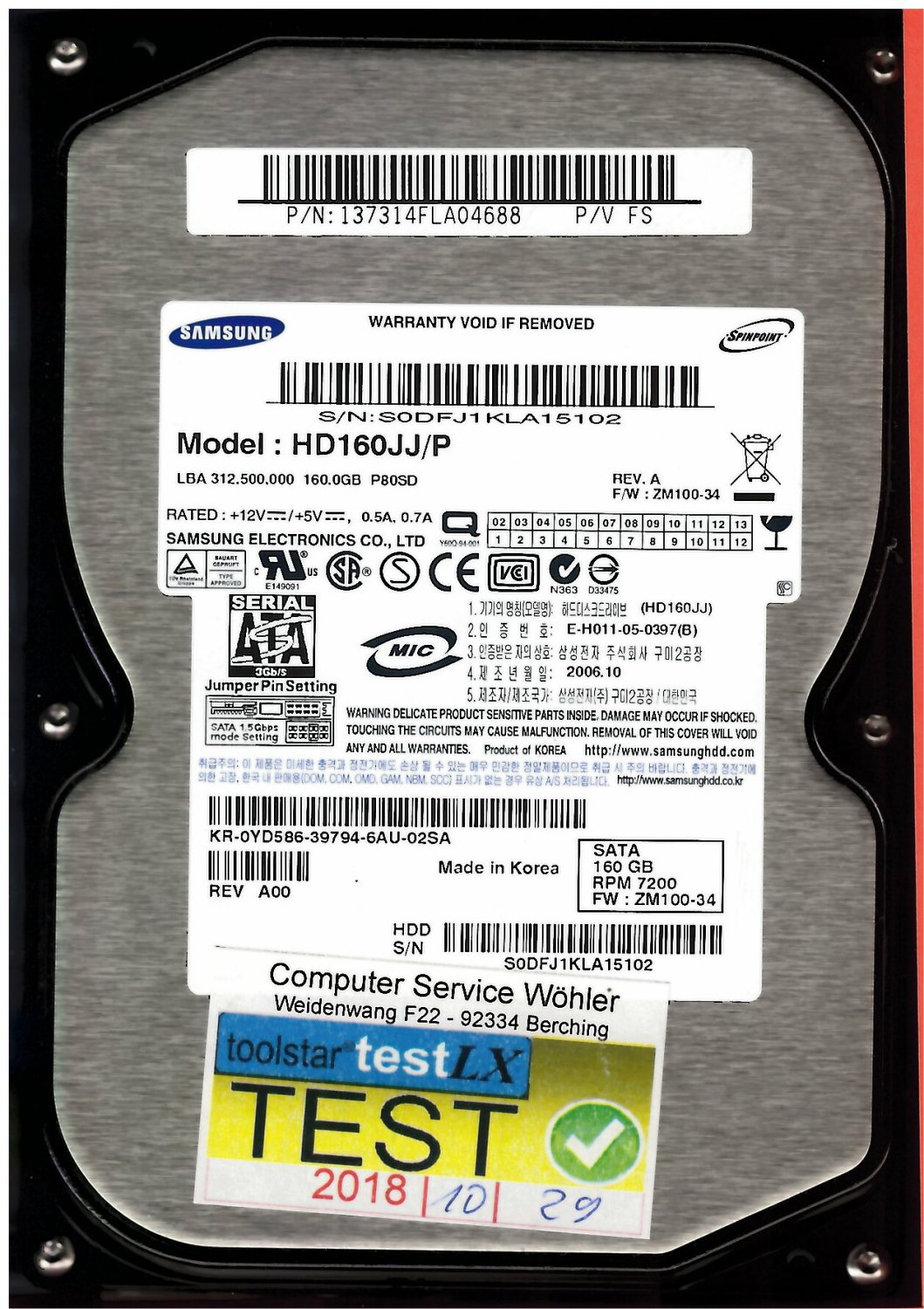 Gebrauchte Festplatte SATA Samsung HD160JJ /P 2006.10