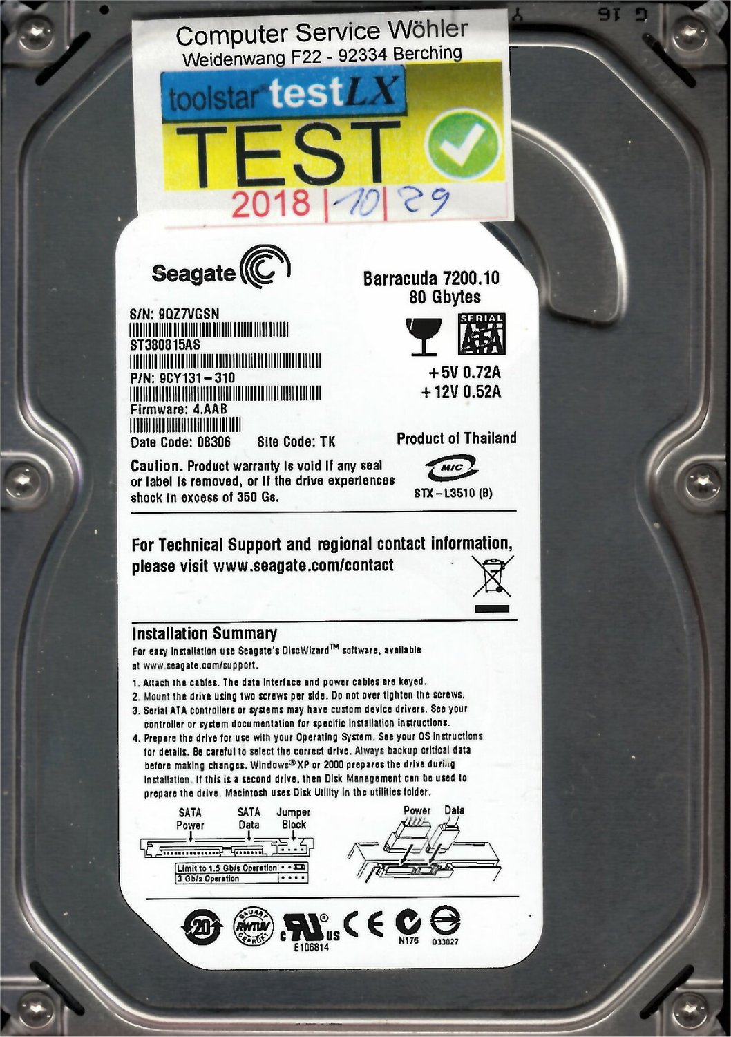 Gebrauchte Festplatte SATA Seagate Barracuda ST380815AS 08306