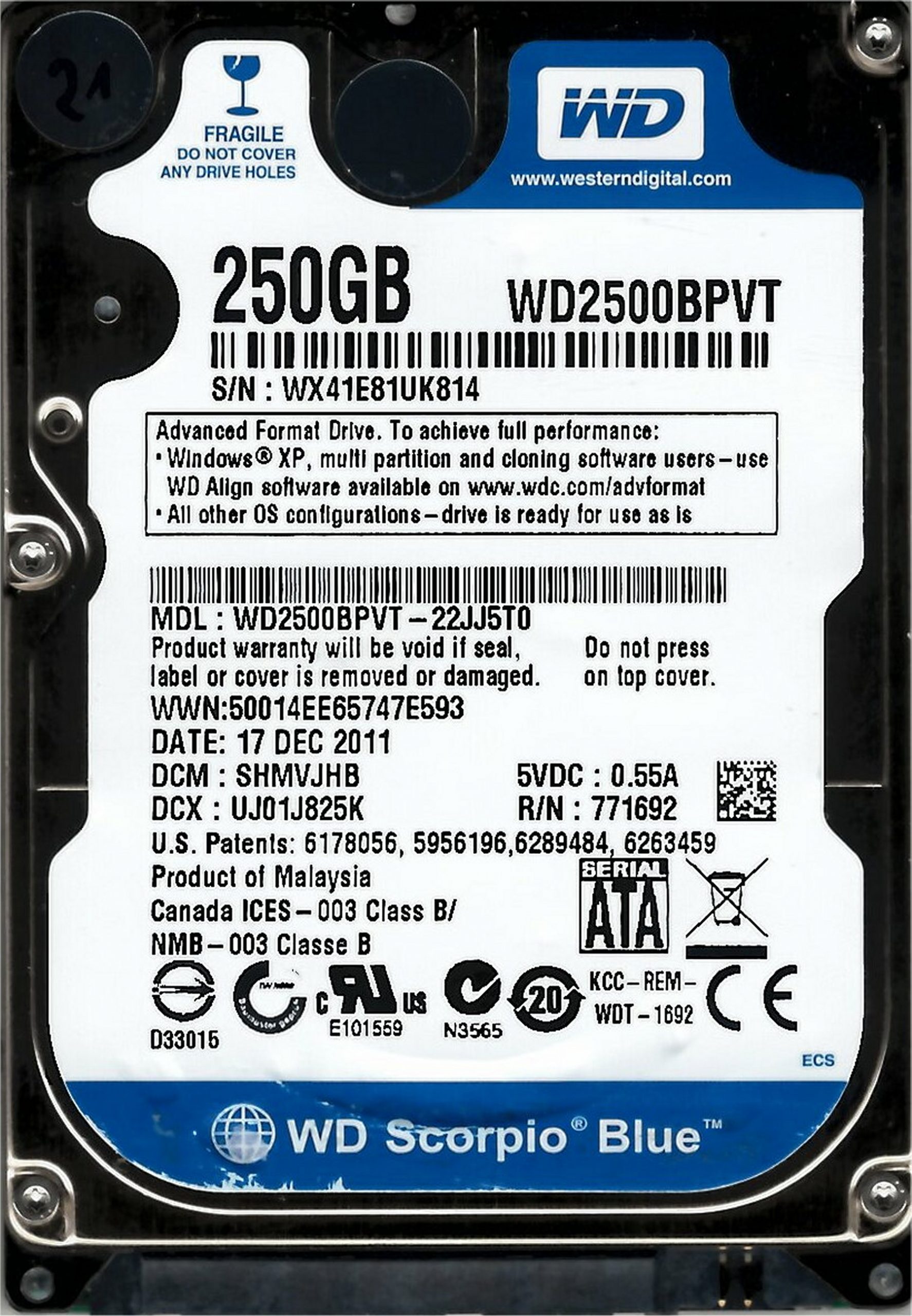 Gebrauchte Festplatte SATA WD2500BPVT – 22JJ5T0